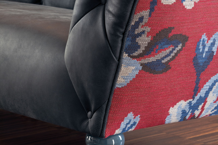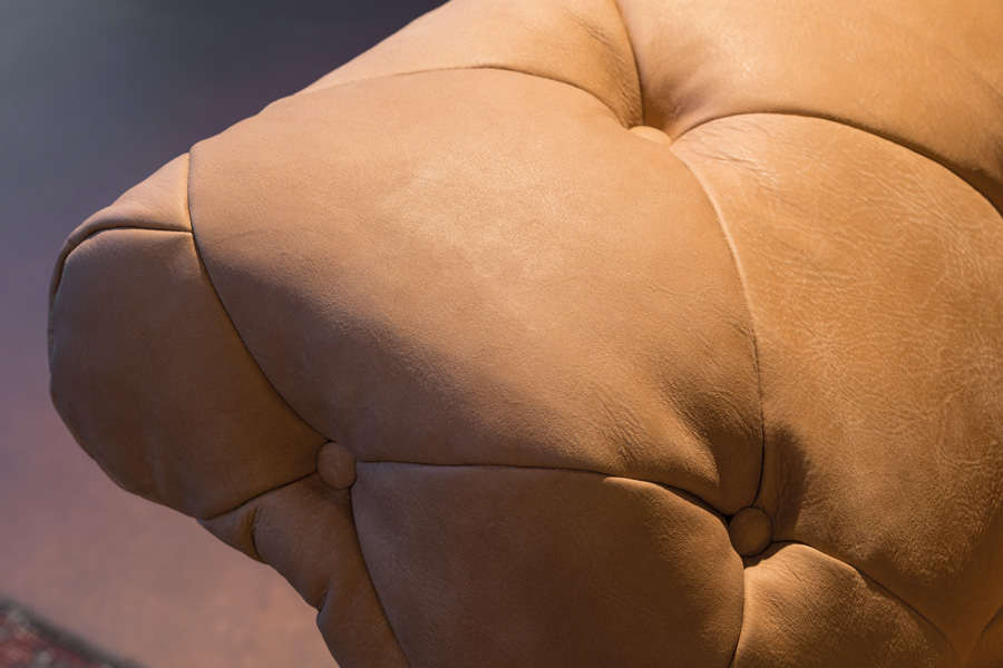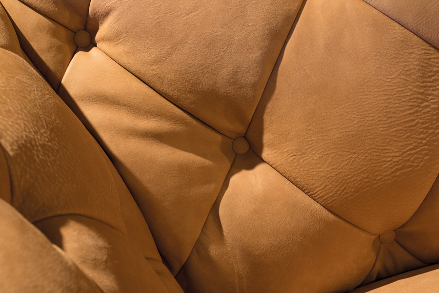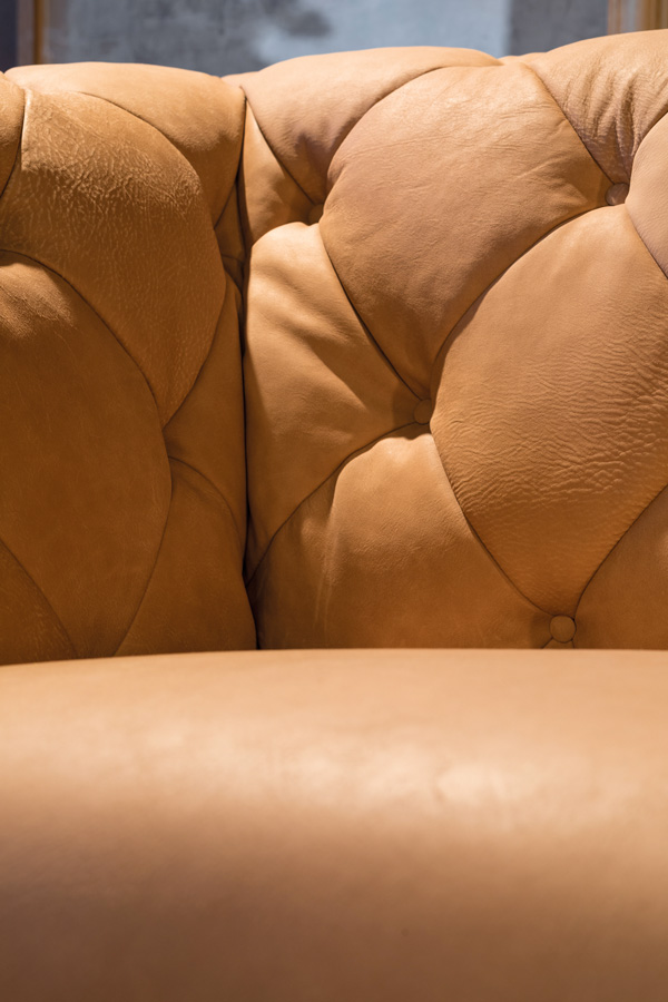 Le forme sinuose del divano Mino si arricchiscono di lavorazione capitonné su piuma a cuscinetti singoli. Morbido ed accogliente il rivestimento in pregiata pelle europea con concia al cromo e tinta all’anilina lo trasforma in Mino Soffice. Sempre particolare il rivestimento dello schienale in tessuto inglese. A concludere l’ampia lavorazione artigianale i piedini torniti a mano e laccati a campione.