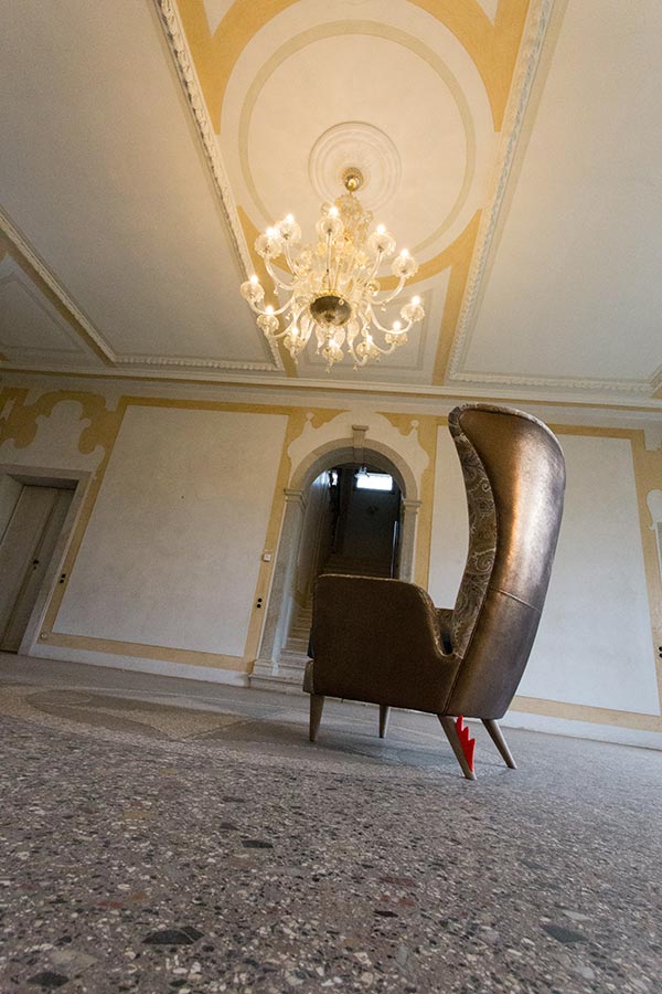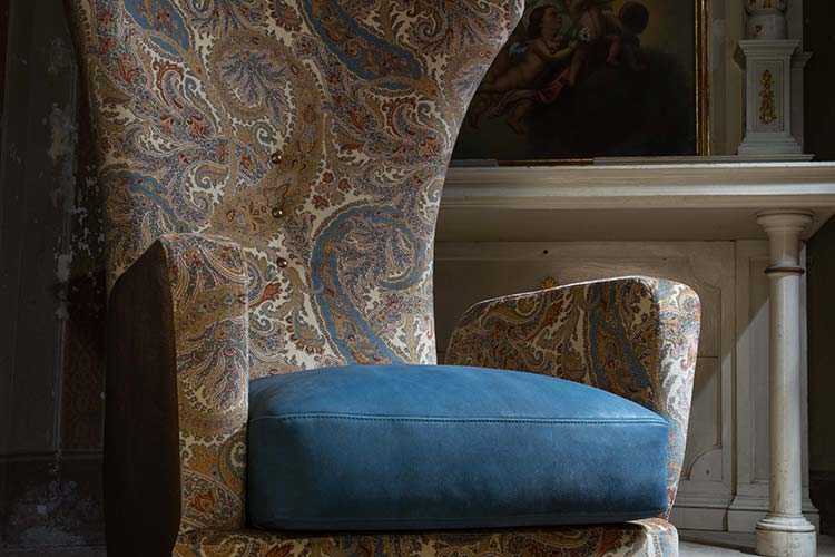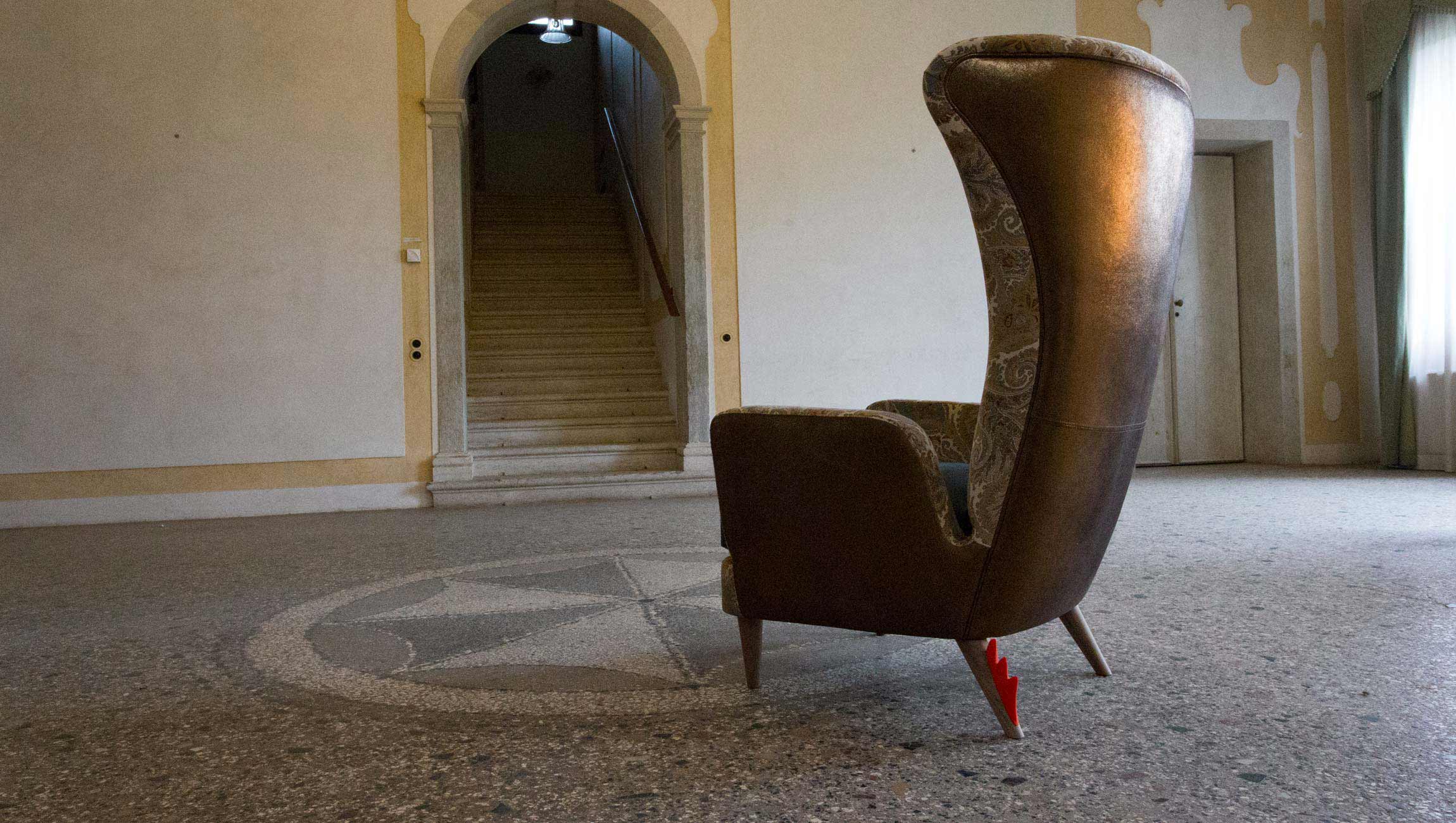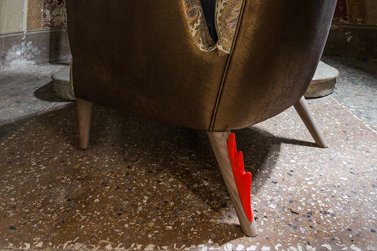 Struttura in legno massiccio e multistrato con cinghie elastiche, imbottitura schienale e bracciolo in poliuretano espanso indeformabile due densità, piedino in legno nella variante noce o faggio, cresta stampata con tecnologia di stampa 3D in ABS, collezione non sfoderabile.