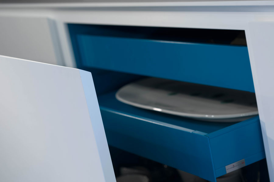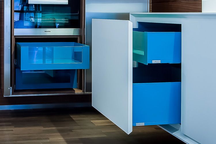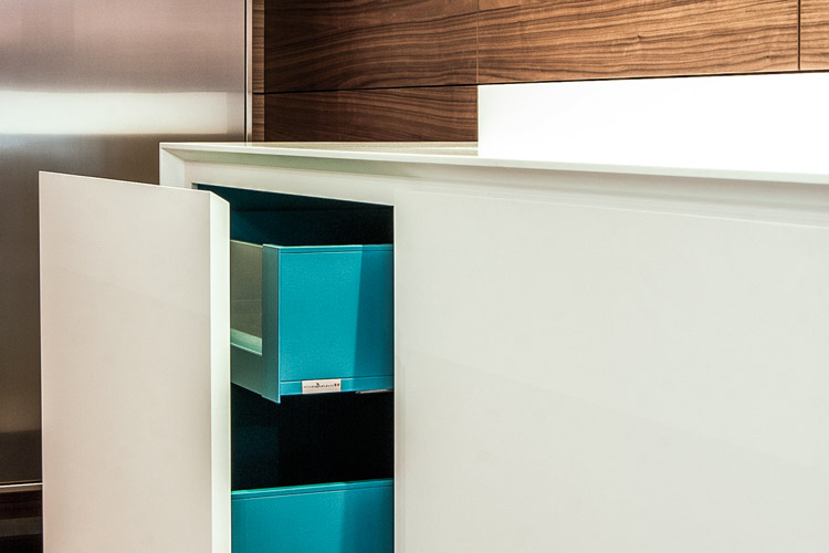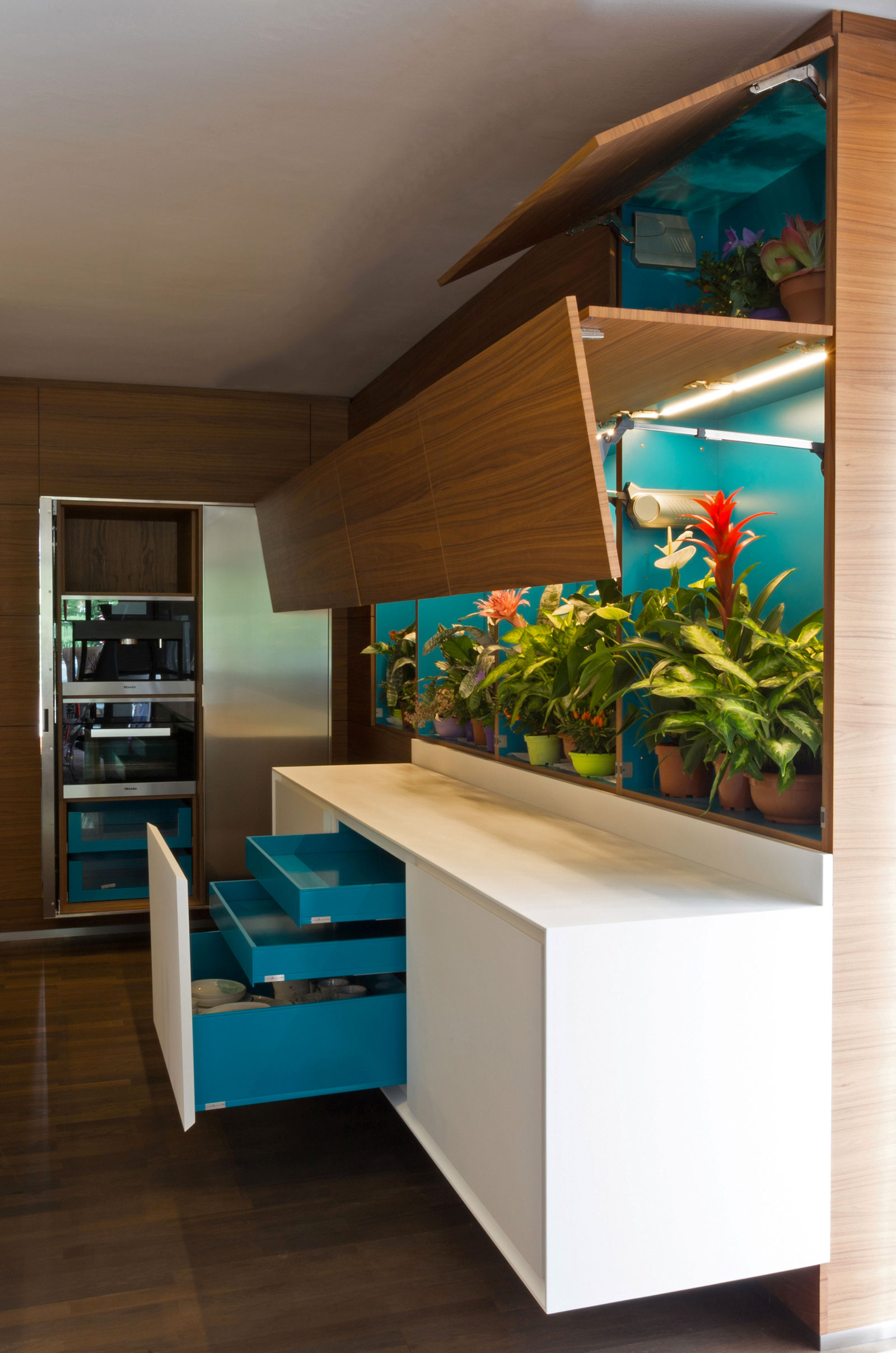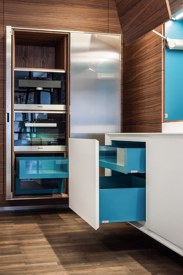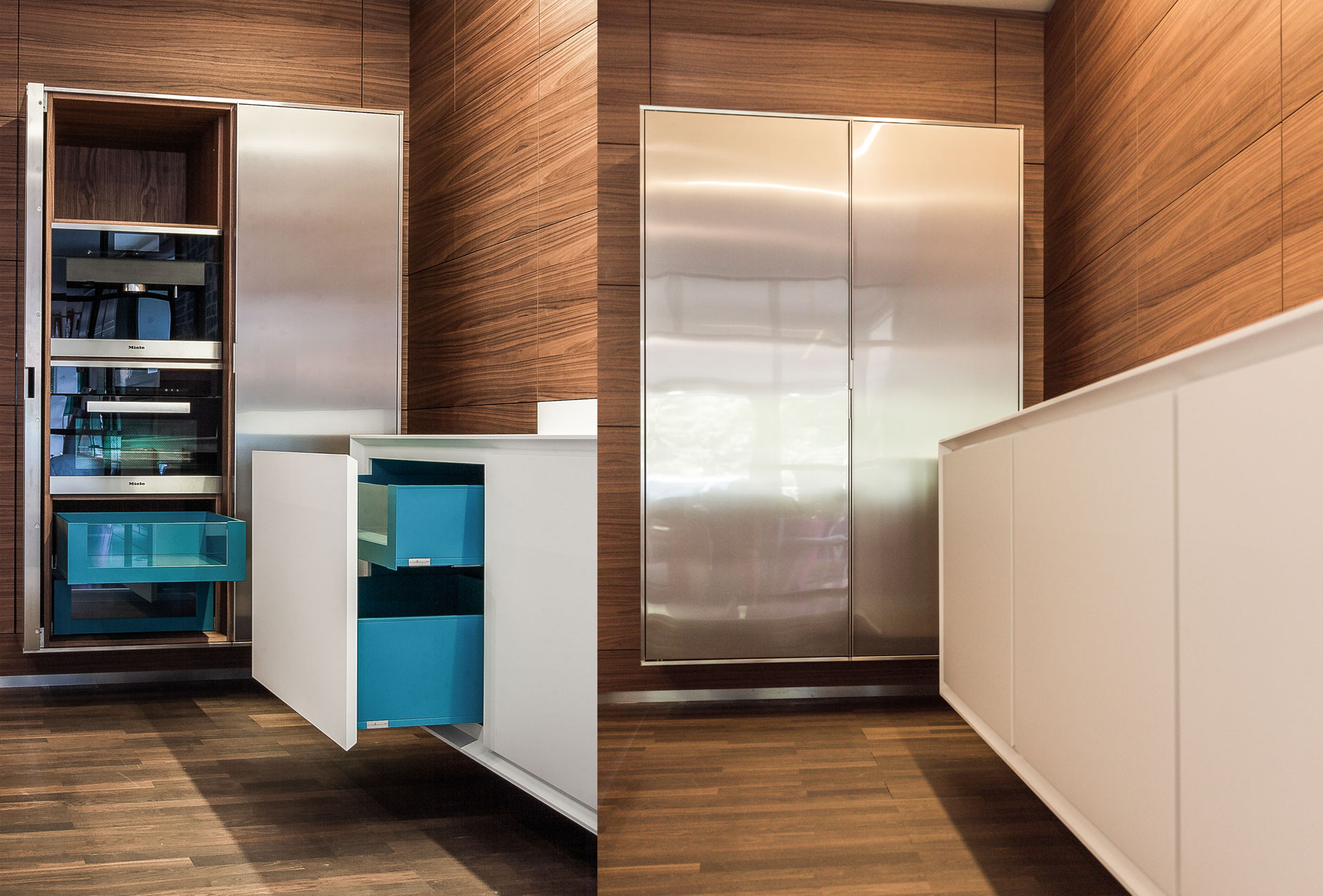 Contenitori per elettrodomestici sospesi, realizzati in acciaio anti-touch, interno noce e laccatura a campione.