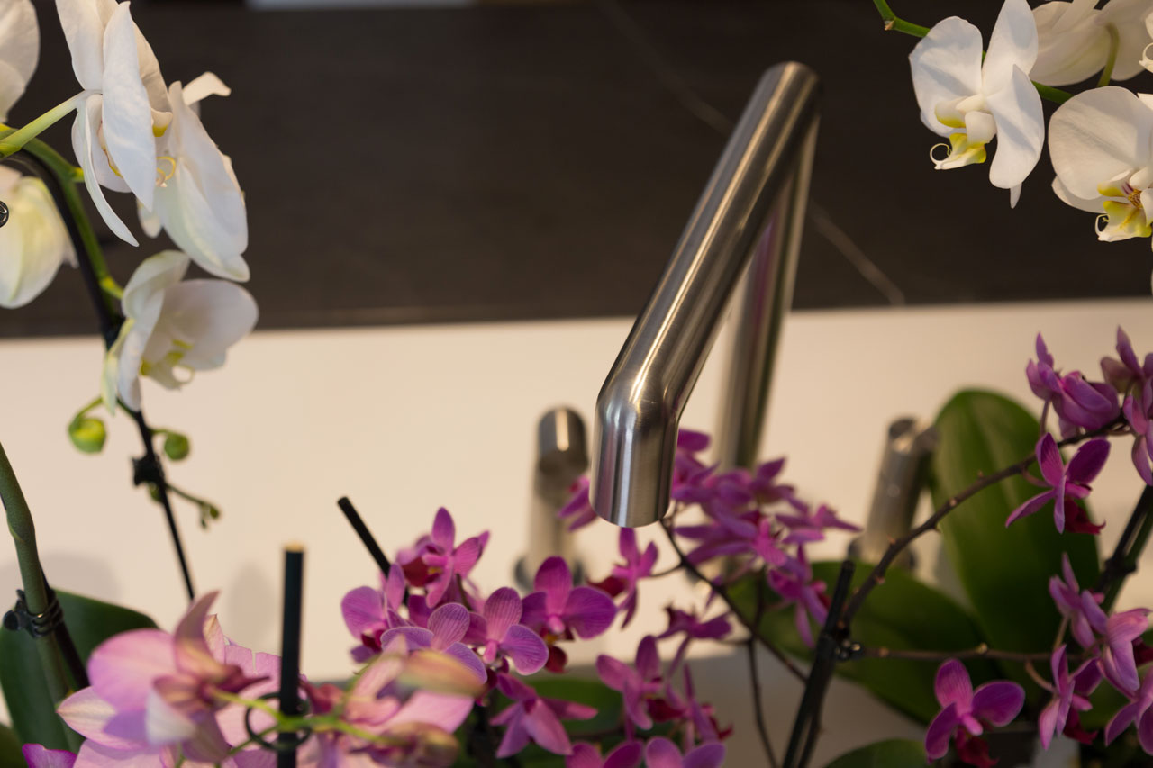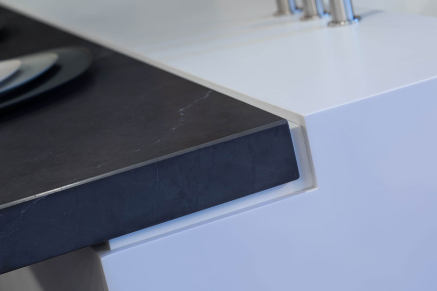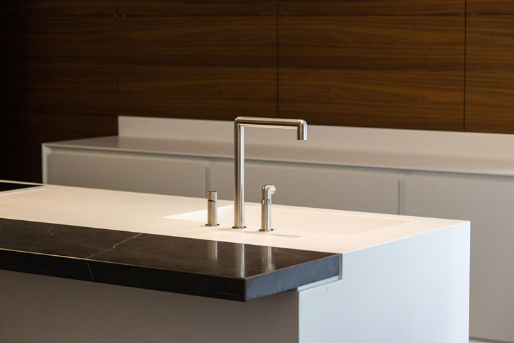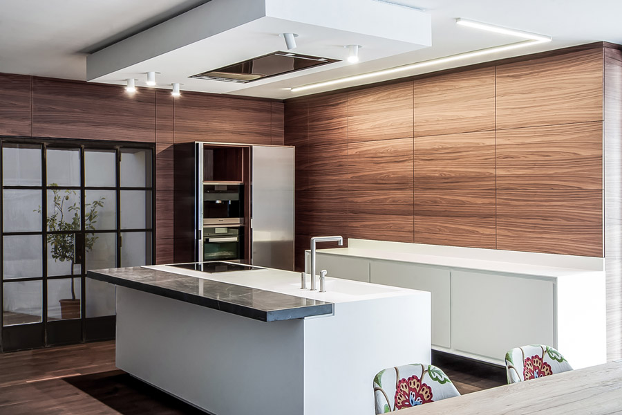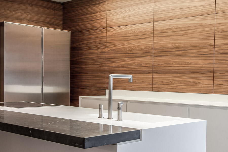 Cucina Hidewall su misura con boiserie contenitiva in essenza di noce, apertura soffietto e vasistas, contenitori sospesi in corian con lavorazione taglio 45°, interno a misura, laccatura a campione, isola in corian con lavello in corian, piano cottura induzione Miele, piano snack in marmo grey con logo inciso a mano.