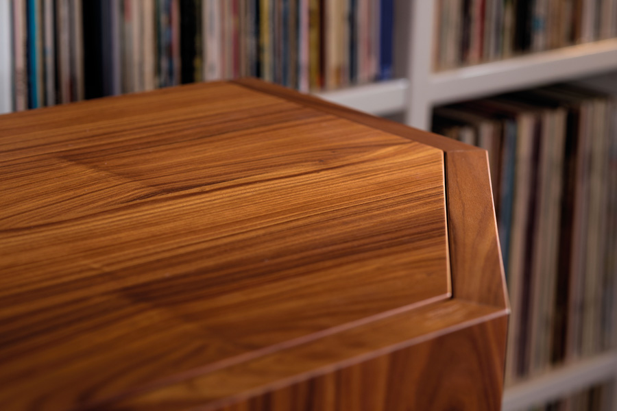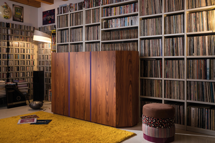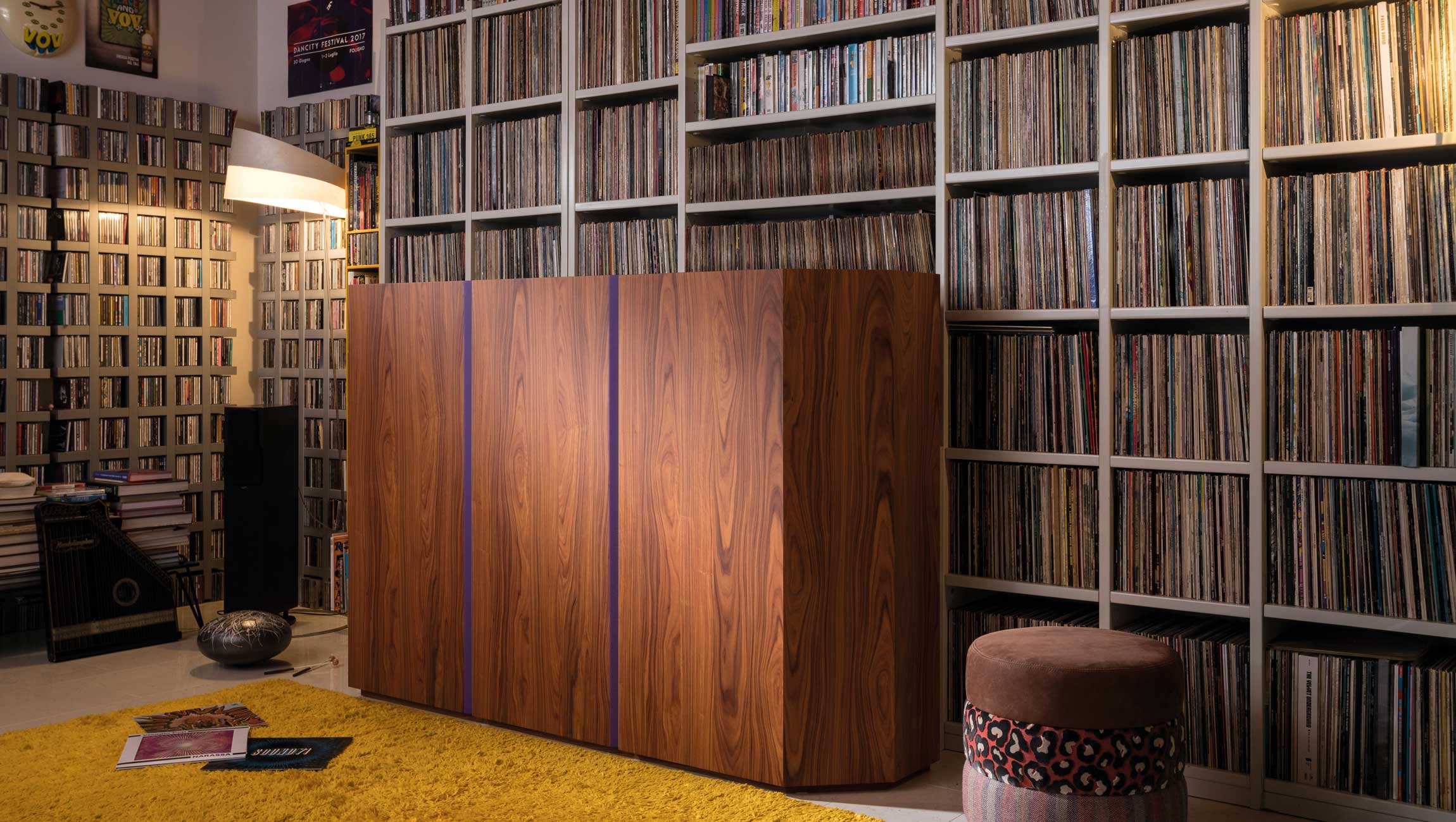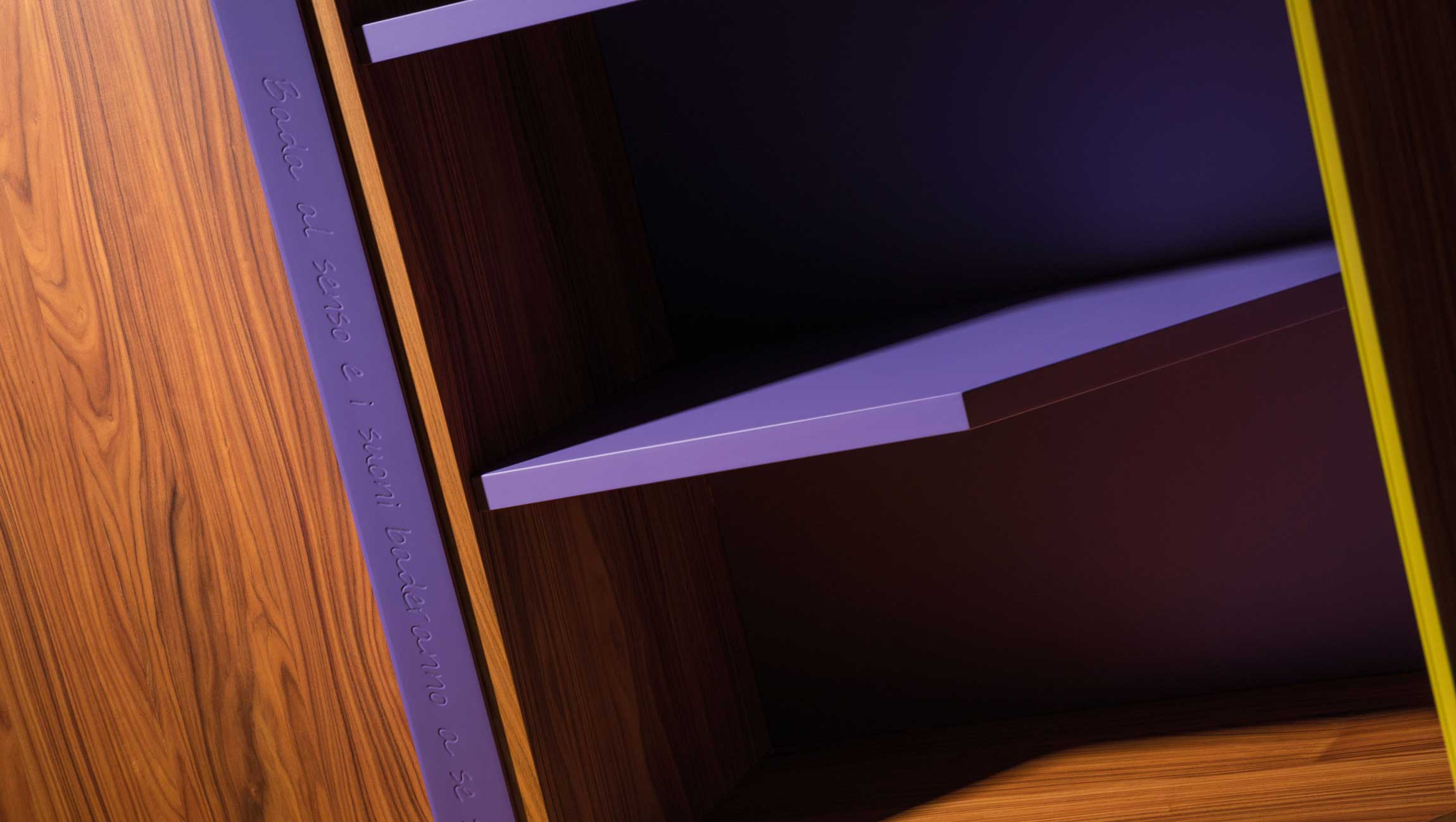 In_Canto, gioco di angoli magistralmente calibrati, esaltati dallo splendore della materia. Palissandro santos e laccature bicolore, tinte piene, inusuali e per questo molto centrate, mettono in risalto le linee pulite, moderne del mobile e della maniglia. Curatissimo anche l'interno sempre in palissandro santo e laccato a campione.