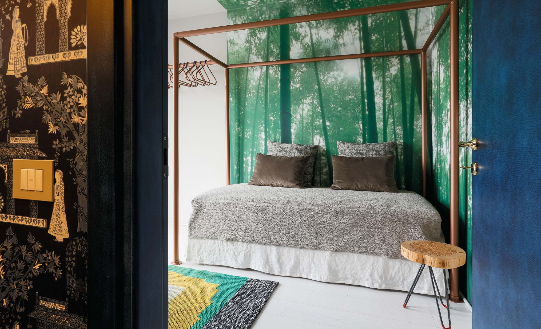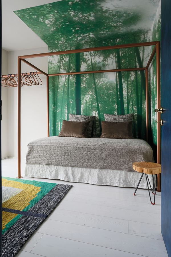 Un Rimando rinascimentale ci porta a pensare ad un ambiente decorato che contiene il letto e altri mobili e Millenove89 ha interpretato questo concetto creando con Alcova Vegetale un “nido” che è si comodo letto ma anche pratico divano e armadio a giorno, il tutto circondato da immagini, date dal rivestimento murario, di rigogliosa natura che accoglie e inebria l’ospite.